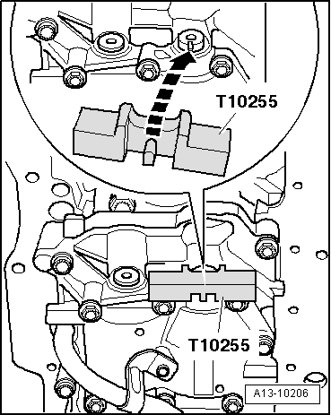 - Zajistěte vyvažovací hřídel přípravkem T10255 v montážní poloze